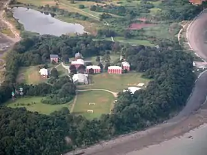 The island's highest point is a drumlin that reaches a height of 78 feet (24 m) above sea level. The rest of the island comprises low rolling hills and a salt marsh. The island has a mixed vegetation, including hardwood tree stands, remnant pear and apple orchards, ornamental trees and shrubs, and salt marsh grasses. The island has open meadows, forests, marine wetlands, sumac groves, and a variety of other geological features as well. Amenities include a formal school campus complete with classrooms, dormitories, dining hall, auditoriums, gymnasium, lab space, outdoor challenge courses, and climbing towers.[1] At low tide, a sandbar connects it to Squaw Rock on the Squantum peninsula, allowing land travel between the two.