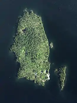 ![]() Three Mile Island (left), shown here with Rock Island (middle right), Hawks Nest Island (bottom right), and Nabby Island (between Three Mile and Hawks Nest) | |