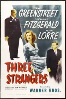 Three Strangers is a 1946 American film noir crime drama directed by Jean Negulesco and starring Sydney Greenstreet, Geraldine Fitzgerald, and Peter Lorre, and featuring Joan Lorring and Alan Napier.[2] The screenplay was written by John Huston and Howard Koch. It was produced and distributed by Warner Brothers.