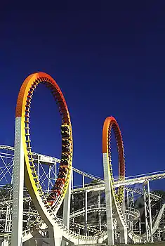 Built by Japanese firm Sanoyas Hishino Meisho, the Thunderbolt measured 1,207 metres (3,960 ft) in length making it the longest roller coaster in Australia.[3][7] Even after the ride's closure, it remained the longest Australian roller coaster until the opening of DC Rivals Hypercoaster at Movie World Gold Coast in September 2017.[8] It was capable of reaching speeds of up to 87 km/h (54 mph).[3] The ride, which stood 31 metres (102 ft) off the ground, featured two vertical loops standing at 21 metres (69 ft) each.[3]