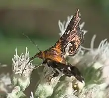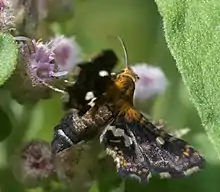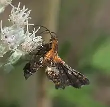 Thyris maculata, the spotted thyris, is a species of window-winged moth in the family Thyrididae.[1][2][3]