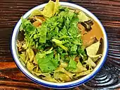 | Guobacai | 鍋巴菜 | 锅巴菜 | guōbācài | ![]() | A snack of strong local flavor, Guobacai is a sort of pancake made of millet and mung bean flour. The pancake is sliced into linguine-like noodles and cooked in the sauce made of sesame oil, chopped ginger, soy sauce, preserved beancurd and green onions. Guobacai is often served along with fried dough and sesame cakes for breakfast.[10] |