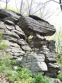 Ticklish Rock is an unusual sandstone rock formation, located in Shrewsbury Township, Sullivan County, Pennsylvania. The brown and green sandstone formation, which stands at the edge of a steep cliff and resembles an upright hammer. It consists of a large horizontal block, 3 feet high, 8 feet long, and 6 feet wide (0.9 x 2.4 x 1.8 m), balanced upon a thin, 18 in × 30 in (46 cm × 76 cm) pedestal.