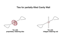 Typically, ties in a cavity wall are double triangular shape (like a bow), though, depending on the existence of another layer (e.g. insulation sheet) at the cavity, which fills the cavity partially, ties include retaining discs or rods.