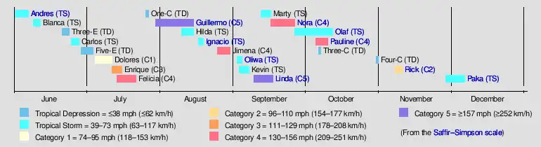 The 1997 Pacific hurricane season was the most active season since the 1994 season, producing 24 tropical depressions, 19 of which became tropical storms or hurricanes. The season officially started on May 15, 1997 in the Eastern Pacific—designated as the area east of 140°W—and on June 1, 1997 in the Central Pacific, which is between the International Date Line and 140°W. The season officially ended in both basins on November 30, 1997. These dates typically limit the period of each year when most tropical cyclones form in the eastern Pacific basin. This timeline documents all the storm formations, strengthening, weakening, landfalls, extratropical transitions, as well as dissipation. The timeline also includes information which was not operationally released, meaning that information from post-storm reviews by the National Hurricane Center, such as information on a storm that was not operationally warned on, has been included.