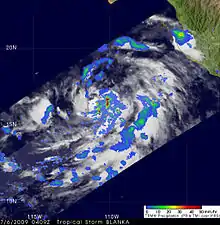 TRMM satellite image of Blanca on July 7 showing rainfall rates exceeding 2 in/h (50 mm/h)