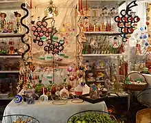 This is one of two established large factories in the town.[10] In addition, there are about 150 smaller workshops making various kinds of handcrafted Christmas decorations and most families in the area make them on the side at home.[8][11] Even with large-scale production, creation of the glass spheres is still mostly artisanal, including the blowing of the glass and painting. Handcrafted spheres are blown, usually by men. When cool, the glass spheres are usually taken to be covered in a silver nitrate or similar solution, to give them a metallic look. Colors vary and include red, pink, yellow, blue gold and pearl.[8][12] The classic ornaments are simple glass spheres but there are over a thousand different models available with shapes such as fruits, Santa Claus, pencils, dolls, snowmen, monkeys and many more.[10] Workshops in the area have over 300 standard designs for the sphere, which include hearts, stars, harlequins, flowers, comets and more. Most of the painters are women.[8][12] A number of the designs of the glass spheres are unique to the town.[9] The creation of these glass spheres have given the town a reputation.[3] Local authorities see the ornament industry as a way to stem emigration out of the area.[11] The industry employs about 10,000 people, and accounts for about 70% of the town's economy. As of 2015, there were about 200 workshops in town that produced more than 100 million ornaments per year.[13] From November to early December, the seat hosts an annual fair dedicated to Christmas decorations called the Arte Navideño. It exhibits ornaments, trees and other Christmas decorations.[3][10] About 5% of the ornaments are sold during the fair, 35% in the rest of Mexico and about 60% are exported to countries such as the US, Canada, Argentina, Japan and Malaysia.[13]