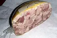 Tobă,[1] "caș de cap de porc" (which means "pig head cheese"), is a kind of a traditional Romanian delicatessen item which looks like a wide sausage, around four inches in diameter, usually using a pig's stomach, stuffed with pork jelly, liver, and skin suspended in aspic.[2]