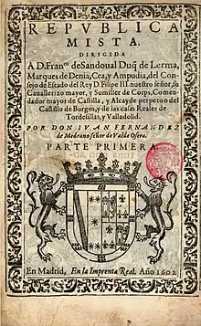 The Mixed Republic[36] is a political treatise written by Tomas Fernández de Medrano and published in Madrid by Juan Flamenco in 1602. Miguel Herrero's assertion in his introductory study to Fray Juan de Salazar's book confirms this is the work of Medrano. Fray Juan de Salazar states that Don Juan Fernández de Medrano y Sandoval, from the house of the Lords of Valdeosera, is the one who assumes the paternity of this book, which appeared in Madrid in 1602 under the label of República Mista. However, he concludes by saying that from what the cover says, the work was written by his father, Tomás Fernández de Medrano.[37] Nicolás Antonio does not hesitate to attribute the authorship of the Mixed Republic to Tomás Fernández de Medrano: "verus istius operis autor". This paternal-filial duo is repeated in the Orazion consotoria to the lord Carlo Emanuel, Duke of Savoy, the author being Thomas and the one who gives it to the press his son Juan. Likewise, the funeral oration to the gifts of King Felipe Segundo is the work of Tomás Fernández de Medrano. The Mixed Republic published, according to the author himself, corresponds "to the first treaty of seven that has written", a relatively frequent occurrence at this time, of the publication of a first installment, "to see how it is received", of a draft of claims broader, which were never consummated.[1]