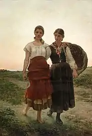 In 1886, he was awarded a stipend from the provincial government in Oviedo, to help finance further studies in Rome. Later, thanks to critical praise for several of his works, the stipend was extended, allowing him to tour Italy and France, and spend his summers at home with his group. With "At the Fall of Evening", painted in Rome in 1889, he was awarded a third-class medal at the Exposición Nacional de Bellas Artes in 1890. It was acquired by the Ministry of the Interior, and may now be seen at the Museo del Prado.