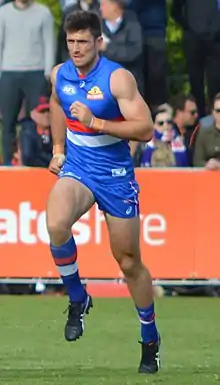 Tom Campbell (born 2 November 1991) is a professional Australian rules footballer currently playing for the St Kilda Football Club. Campbell previously played for the Western Bulldogs and North Melbourne Football Clubs in the Australian Football League (AFL). He was recruited by the club in the 2012 Rookie Draft, with pick #27. Campbell made his debut in Round 13, 2012, against Brisbane Lions at Docklands, having been promoted to the senior list to replace the suspended ruckman Will Minson.[1] After being delisted by the Bulldogs at the conclusion of the 2018 AFL season, Campbell joined North Melbourne as a rookie in the AFL's new supplemental selection period (SSP). On his debut for North Melbourne, senior coach Brad Scott described Campbell as a fierce competitor who gives his all for the team. Campbell reached his 50th AFL game during the 2021 season, where he was lauded by his teammates and coaches for his leadership and guidance while playing tandem in the ruck with Todd Goldstein.[2] Campbell was delisted by the Kangaroos in October 2021,[3] but signed with St Kilda as a delisted free agent the following month.[4] He made his St Kilda debut against Port Adelaide at Cazalys stadium, Cairns during round 7 of the 2022 season.[5]