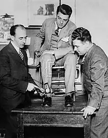 ![]() Howard (center) wearing the camera he used to take the photo of Ruth Snyder's execution c. 1928 [1] | |