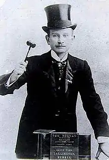 Over the next few years, Norman's travelling exhibitions featured Eliza Jenkins, the "Skeleton Woman", a "Balloon Headed Baby" and a woman who bit off the heads of live rats—the "most gruesome" act Norman claimed to have seen.[1][3] Other acts included fleas, fat ladies, giants, dwarves and retired white seamen, painted black and speaking in an invented language, billed "savage Zulus".[6] He displayed a "family of midgets" which in reality was composed of two men and a borrowed baby.[7] He operated a number of shops in London and Nottingham, and exhibited travelling shows throughout the country.[1] In 1882, Norman gave a show at Islington's Royal Agricultural Hall. Unknown to Norman, the show was attended by American showman P. T. Barnum. Norman falsely claimed to his audience, as he had often done in the past, that his show had been booked to appear at Barnum's 'Greatest Show on Earth'.[7] Barnum was much amused and afterwards, seeing Norman's silver necklace and noting his gift for oratory, dubbed him the 'Silver King'.[1][3] With 13 shops in London alone, Norman ran into a shortage of curiosities and travelled the country looking for new acts.[8] He enticed human novelties into his employ with promises of generous salaries.[8]