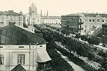 Early 20th-century view of the town. Kaliska Street, now Piłsudskiego Avenue. In the background of the photo, the Orthodox Church of St. Nicholas the Wonderworker, existing on the main square of Tomaszów since 1901 to 1925.[6][7]