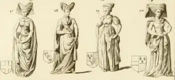 The male figures are shown in more active poses, including their legs being shown in mid-step. They hold a number of objects to reflect their high status, including an org or sphere (figure A).[19] The women's clothing reflects fashions popular amongst Burgundian nobles in the early 15th century. Their sleeves and robes are exceptionally long, and most of the women have tightly pinned or shaven hairlines, reflecting the 15th century fashions evident from portraits by Rogier van der Weyden and Petrus Christus. The female weepers are dressed in expensive and luxurious clothing,[19] in particular figure I's houppelande spills and gathers on the floor; an excess indicating her wealth and status.[28] Figure H has a partially shaved head and turban decorated with rows of pearls and a brooch. Two females wear houppelandes – long dresses with a full body and wide sleeve.[28]