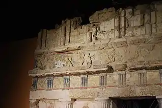 The facade is 8.68 m wide and 8.6 m high. It once had a triangular pediment with a tympanum containing relief decoration, but this is almost entirely lost as a result of severe damage suffered by the facade in antiquity. Below this, there is an upper story with six Ionic columns in antis, which are 1.46 m high. In between these columns are seven 'false windows'. The upper part of most of these has also been lost. Below the columns, is a relief frieze depicting a battle of horsemen & infantry, who are probably Macedonians and Persians. The figures are made from lime mortar, their armour and clothes are painted, and the background is dark blue. Below this, there is a cornice with floral designs on a dark blue background and an entablature made up of dark blue triglyphs and metopes with a centauromachy. The lower half of the facade consists of four Doric columns in antis. The doorway to the antechamber is in the central intercolumniation.[1][2]