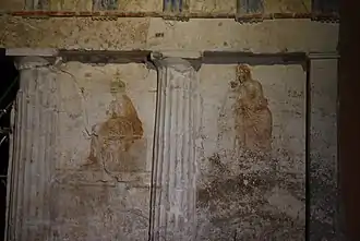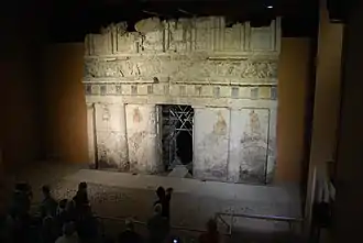 The interior of the structure is made up of two separate barrel-vaulted structures. The antechamber is unusually large: 6.5 m wide, 2.12 m long and 7.7 m high. This is because it is built to match the monumental scale of the facade.[1] The chamber seems to have been unpainted, but it was severely damaged in antiquity and has not been fully excavated.[2] The burial chamber is also barrel-vaulted, but is much smaller, measuring 4.8 m wide, 4.72 m long, and 5.26 m high.[1] The walls are covered in stucco. A white podium with a cornice runs around the base of the wall, supporting white stucco pilasters in low relief, which themselves support an architrave, topped by a cornice. The wall between the pilasters is painted red, and the faux architectural members are decorated with painted rosettes.[1] The design recalls wall painting in houses from the same period that have been excavated in Pella and Delos.[2] The grave goods included a wooden couch with ivory elements, most notably a small sculpture of a woman, which was found in the antechamber.[3]