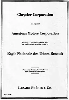 Tombstone finalizing the purchase of American Motors by Chrysler from Renault that was completed by Lazard in 1987[1]