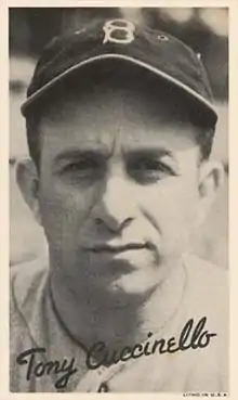 Anthony Francis Cuccinello (November 8, 1907 – September 21, 1995) was an American professional baseball second baseman and third baseman, then a longtime coach. He played in Major League Baseball (MLB) for the Cincinnati Reds, Brooklyn Dodgers, Boston Bees / Braves, New York Giants and Chicago White Sox between 1930 and 1945. He was the older brother and uncle, respectively, of former major league players Al Cuccinello and Sam Mele. His surname was pronounced "coo-chi-NELL-oh".[1]