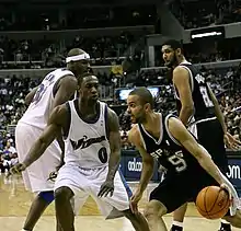 After initially playing backup to Antonio Daniels,[23] Parker became a starter and made 77 regular-season appearances in his rookie season, averaging 9.2 points, 4.3 assists and 2.6 rebounds in 29.4 minutes per game.[14] When he played against the Los Angeles Clippers on 30 November 2001, he became the third French player to play in an NBA game, after Tariq Abdul-Wahad and Jérôme Moïso.[26] By the end of the season, the rookie led San Antonio in assists and steals, and was named to the All-Rookie First Team for 2001–02, becoming the first foreign-born guard to earn the honor.[14]