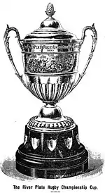 The first trophy awarded to champions was acquired to British goldsmith Elkington & Son through their representatives in Argentina, C.R. Simons & Co., for a price of guinea 100. Built with Greek style, the trophy displayed a scene of a rugby match, with the legends "River Plate Rugby Union Championship" and "1899". The cup was mounted on an ebony base with little silver badges, where the name of the champion would be engraved year-by-year. Most of the money for its acquisition came from the Rosario A.C. members.[4]