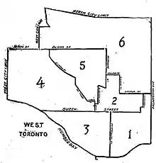 The riding was re-formed in 1894. In the second incarnation, the boundaries were Lake Ontario to the south between Palmerston Avenue in the east and the city limits in the west. The northern boundary was the city limits which was formed by the Grand Trunk Railway right-of-way.[1]