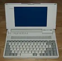 The Toshiba T1000LE was a laptop manufactured by Toshiba starting in 1990 as a member of their LE/SE/XE family. It used a 9.54/4.77 MHz Intel 80C86, with the clock speed being switchable by using function keys on the keyboard. The laptop came with a 20 MB hard drive, 1 MB of RAM, a 1.44M/720K switchable 3.5" floppy drive, and a blue-on-white, back-lit, "Toshiba Graphics" 640x400 STN LCD. The laptop came with a choice of either MS-DOS 3.3 or 4.01 stored in a socketed ROM. The laptop's RAM was expandable to 2 MB, 3 MB, 5 MB, or 9 MB with 1 MB, 2 MB, 4 MB, and 8 MB proprietary memory cards, respectively.[1]