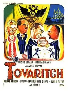 Tovaritch is a 1935 French comedy film directed by Jacques Deval and Germain Fried, along with the uncredited Jean Tarride and Victor Trivas, and starring Irène Zilahy, André Lefaur and Marguerite Deval. It is based on the 1933 play Tovarich by Jacques Deval, who also adapted the screenplay. It was shot at the Francoeur Studios in Paris. The film's sets were designed by the art director Lucien Aguettand. In 1937 the play was adapted again into the Hollywood film Tovarich featuring Claudette Colbert and Charles Boyer.[1]