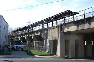 The station opened on February 23, 1886.[2][3] Formerly a surface station, it and the Port Richmond station one stop east were elevated onto the current concrete trestle in 1935 as part of an SIRT grade crossing elimination project, opening as an elevated station on February 25, 1937.[2][4][5][6][7][8] West of the station past Nicholas Avenue, the line recedes into an open-cut.[4] Tower Hill station closed on March 31, 1953, along with the South Beach Branch and the rest of the North Shore Branch.[2][8]
