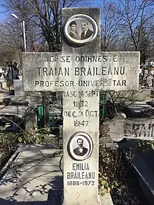 Brăileanu was sentenced to twenty years' imprisonment; another official jailed at the same trial was Ion Petrovici, a successor of his at the Education Ministry.[133] First held at Văcărești Prison before being moved to Aiud Prison,[126] Brăileanu continued working on translations of Aristotle, as well as on a memoir covering the early part of his life.[139] In 1947, he developed a severe ulcer and, gravely ill, was taken to the Brașov prison hospital. In June, a committee of doctors decided he did not require a hospital stay, and he was returned to Aiud.[126] He died there, most likely on October 3.[129] Shortly before, the prison doctor had refused to send him for an operation, and he was not allowed to access a package his relatives had sent.[140] His family managed to bring the body to Bucharest, where he was buried in an Orthodox ceremony[141] at Sfânta Vineri Cemetery.[142] Others who occupy the same gravesite include his wife, who lived until 1972, and his father.[133]