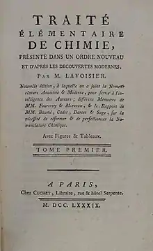Traité élémentaire de chimie (Elementary Treatise on Chemistry) is a textbook written by Antoine Lavoisier published in 1789 and translated into English by Robert Kerr in 1790 under the title Elements of Chemistry in a New Systematic Order containing All the Modern Discoveries.[1][2] It is considered to be the first modern chemical textbook.[3]