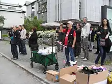 Every Wednesday, the members of the church gather around the "Temple of Corruption" (the National Assembly Building of Slovenia) for holy mass. During the mass, they use pots, pans, and bells to produce clanking sounds.[9] In addition, the members are active in various charity activities, such as helping people without health insurance, homeless, single mothers, and in 2016 also Syrian refugees.[5][10][11]