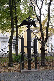The fence consists of 102 bronze cannon barrels, in groups of three, set on thirty-four granite bases. They are set with the muzzles facing downwards to signify they will never again be used in combat. The central barrel of each grouping is topped with a crowned double-headed eagle. The barrel groups are linked by massive decorative chains. The two main gates are decorated with shields with bronze depictions of the medals presented for the war. Also, around the cathedral stand twelve cannons and two Unicorn (long-barreled) cannons, which are the property of the Preobrazhensky regiment.