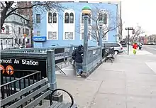 The Tremont Avenue station is an express station on the IND Concourse Line of the New York City Subway. Located at the intersection of East Tremont Avenue and Grand Concourse, it is served by the D train at all times and B train during rush hours only. It has three tracks and two island platforms.