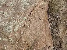 Though described as the Tres Piedras Granite in the earlier studies, the unit is more properly described as an orthogneiss.[2] The orthogneiss is pink to reddish-orange and shows faint to obvious foliation. Grain sizes are from 0.5 to 5 mm. Many of the quartz grains are fractured. With a modal composion of 42% quartz, 40% microcline, and 12% albite, it has the composition of an alkali feldspar granite. It has no contact metamorphism with the Moppin Complex, suggesting the country rock was only slightly cooler when the granite was injected.[3]