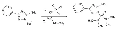 Triamiphos was first synthesised by Van den Bos et al. (1960) by adding the salt of 3-amino-5-phenyl-1,2,4-triazole to a solution of phosphoryl chloride. Subsequently, gaseous dimethylamine is introduced into the reaction mixture to yield triamiphos.[7]