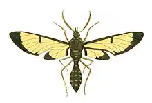 Upperside: Antennae pectinated, and thickest in the middle. Head black, with a blue spot in front. Neck blue. Thorax black, with an orange spot on each shoulder. Abdomen black; smallest next the thorax, with a row of golden-blue spots on each side, and another at the top; at the extremity is placed a hairy bristle, about a quarter the length of the abdomen. Wings yellowish and transparent. The anterior having a black narrow border running round all their edges, except the anterior ones; and in the middle of each is an oblong black spot, joining to the anterior edge, which reaches almost halfway across the wing. Posterior wings with a black border along the abdominal edges and the upper corners; the anterior and external edges having none. The extremity of the body of the male is furnished with a villose tail, as long as the body.
