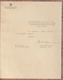 Acknowledging the end of the mission, Miloš Stamatović, administrator of "Zone B", gifts a book of "Zone B" postage stamps to Major General John A. Dabney on 21 October 1954, prefaced with the letter from Miloš Stamatović to John A. Dabney.