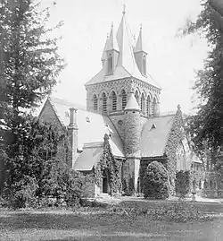 In 1870 the original structure gave way to a larger, more assertively Episcopalian building designed in the Gothic Revival style by Richard Upjohn and his son. This remained until the first decade of the last century, when architect Ralph Adams Cram doubled the nave in length. In 1914, Cram was hired again to create a small chapel in the north transept (the Lady Chapel), a larger French Gothic chancel, and a significantly heightened tower accommodating a small carillon of ten Meneely bells.[4] With some interior alterations, this is today's church building. A stone over the chancel door is from the 13th century St. Oswald's Church near Malpas, the original Stockton family home.[5]