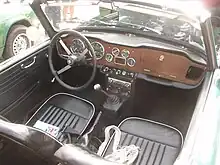Apart from the increase in width and the IRS badge on the rear of the car, other changes include a revised grille and new bonnet badge. There is also a new piece of chrome trim on the side, starting near the rear edge of the door and ending at the front of the car with integrated signal/marker lights, which were moved from their earlier position in the corners of the grille. New smaller front bumpers and a convertible top patterned after the one from the Herald complete the exterior differences. On the interior the fly-off handbrake lever is moved to the transmission tunnel between two revised seats, the gearshift lever is shortened, and fascias in all cars are covered with walnut, which had been optional in the TR4.
