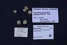 - ↑ MolluscaBase eds. (2022). MolluscaBase. Trochoidea tarentina (L. Pfeiffer, 1848). Accessed through: World Register of Marine Species at: https://www.marinespecies.org/aphia.php?p=taxdetails&id=1050656 on 2022-08-06