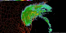 Late on July 9, United States Air Force hurricane hunters flew into the system and detected a low-level circulation center near the edge of its thunderstorms, which indicated a reformation of the original low-level circulation center, with the development of strong convection just east of Cape Hatteras.[1][5] Based on the organization of the system, and observations of 45 mph (72 km/h) sustained winds, the NHC initiated advisories on Tropical Storm Fay at 21:00 UTC on July 9.[6] The storm was located over the warm waters of the Gulf Stream and in an area of light to moderate wind shear; these environmental factors favored intensification of the tropical cyclone.[5] The elongated circulation of the developing storm was steered generally northward by a ridge over the western Atlantic Ocean and by an approaching trough from the south.[7] On July 10, Fay strengthened throughout the day, reaching its peak intensity, with 1-minute sustained winds of 60 mph (97 km/h) and a minimum central pressure of 998 millibars (29.5 inHg), despite some southwesterly wind shear. This wind shear caused the storm to entrain dry air, which gave it a non-classical tropical cyclone structure.[1][8] At that time, Fay had a small circulation center exposed just east of the Delmarva peninsula, which was rotating around a larger circulation.[9] Around 20:00 UTC on July 10, Fay made landfall just north-northeast of Atlantic City, New Jersey with maximum sustained winds of 50 mph (80 km/h).[1] By that time, the system was already losing some of its tropical characteristics, with rapidly decreasing amounts of thunderstorms near the center and the deepest convection displaced well to the east and southeast of the center.[10] Fay continued weakening as it moved northward through New Jersey, and weakened into a tropical depression as it crossed into southeastern New York.[11] Early on July 11, the system transitioned into a post-tropical cyclone as the center became devoid of deep convection.[12] Afterward, Fay's remnants were drawn into the circulation of an approaching extratropical storm, before being fully absorbed into the approaching system over Quebec on July 12.[13]