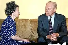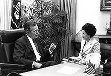 President Jimmy Carter, in a 1977 interview with Feldman, hinted that efforts to promote an Arab-Israeli settlement might have to be suspended.[5] Carter elaborated on this new approach in another interview with her that startled the Arabs. It was a generous face-saving offer to the Prime Minister of Israel Menachem Begin by Carter, giving Israel the opportunity to accept the notions of withdrawal from the West Bank and of participation by the Palestinians in a gradual, limited process of self-determination.[6]