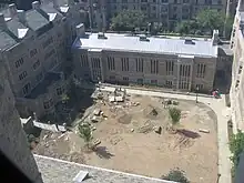The gym was torn down and the dormitories connected with a new building in the Collegiate Gothic style. The new building contained the Trumbull dining hall, common room, and library. A new dorm wing was constructed parallel to the originals and a faculty member's house (first known as the Master's House and since April 2016 as the Head of College House) was added. With the Sterling Memorial Library to the north, the buildings formed the Sterling Quadrangle. The buildings split the quadrangle into three separate courtyards — Alvarez (Main) Court, Potty Court, and Stone Court.