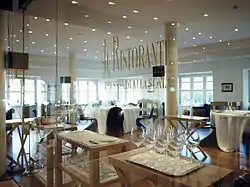 Founded in 2006, Ristorante Trussardi Alla Scala has received two Michelin stars.[57] The first was received in 2008 and the next in 2009, given to executive chef Andrea Berton.[58] Attached is the Café Trussardi, which houses an open courtyard overlooking the square, and its glass walls also face Teatro alla Scala and the other buildings on the promenade.[59]