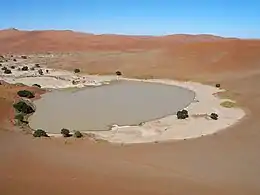 The Tsauchab is approximately 150 km (93 mi) long, its catchment area (including its tributary, the Zebra River) is estimated to be between 4,000[1] and 4,431 km2 (1,711 sq mi).[2] Since it is in the Namib Desert, the Tsauchab carries water only during the rare times when rain falls in the Naukluft Mountains and runs off, since it cannot seep into the soil fast enough (see flash flood). During these rains, the Tsauchab becomes a rapid-running, strong river within a matter of hours. As a result of the occasional rains, it has over the past two million years carved the Sesriem Canyon, a 1 km (0.62 mi) long and up to 30 m (98 ft) deep canyon in sedimentary rock. Past the canyon, the Tsauchab flattens and grows broader, and is surrounded by a riparian forest as it slopes towards the Sossusvlei salt pan. In the Sossusvlei area, the riparian forest consists of both the living trees including Maerua crassifolia and the remaining skeletons of dead trees.[3]