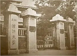 In August 1933, Tianjin University of Commerce was registered with the Ministry of Education of the Nationalist Government.[8] However, as the former departments did not meet the standards of "university" (three colleges and nine departments), the institute was renamed as the Hebei Private Tianjin Institute of Commerce.[5] At the end of 1936, the Suiyuan War broke out, and the students of Tianjin Institute of Commerce organized aid for Suiyuan.[9] In 1937, Tianjin Institute of Commerce changed its engineering department to an engineering college, retaining the Civil Engineering Department and adding the Department of Architecture, with architect Chen Yanzhong appointed as the head of this department.[1] In August 1937, the Japanese occupied Tianjin, and Hua Guanggui had fled to France to avoid persecution by them. The Tianjin Institute of Commerce, due to its affiliation with the Catholic Church and the French government, did not relocate within Tianjin, unlike other universities such as Nankai University and Beiyang University, and continued its operations. It became one of the few colleges to persist in teaching in the occupied areas during the War of Resistance against Japan. Some students from Zhili and surrounding areas who couldn't relocate applied to Tianjin Institute of Commerce, leading to a sharp increase in the number of enrolled students.[5] By July 1945, the number of enrolled students at Tianjin Institute of Commerce had increased from 141 before the war to 626. In 1943, Tianjin Institute of Commerce established a women's college. On August 13, 1947, during the 34th meeting of the Board of Directors of the Private Tianjin Institute of Commerce, it was unanimously agreed to change the institution to a university and rename it as Tsin Ku University.[10]