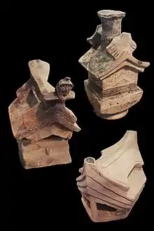 In addition to the post holes, there are also models of houses or temples that seem to indicate construction with bahareque,[10] a technique for making walls that consists of covering with mud a skeleton of interwoven reeds. The downward curved roof that some of these models have seems to indicate the use of bamboo|beams, which bend due to the weight of the roof since it is a flexible material. Some of these models show animals incorporated into the architecture.[14]