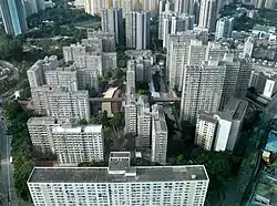 ![]() Aerial view of Tung Tau Estate. The long building in the foreground, Block 22, has since been demolished. | |