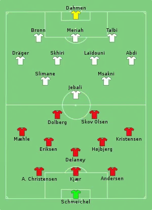The two teams had faced each other twice, most recently in 2002, a 2–1 win for Denmark in a friendly game. Denmark were not able to capitalize in their opening game; although Tunisia failed to score a single goal themselves, they still managed to secure their match without problems, with Aïssa Laïdouni earning the Man of the Match.[50]